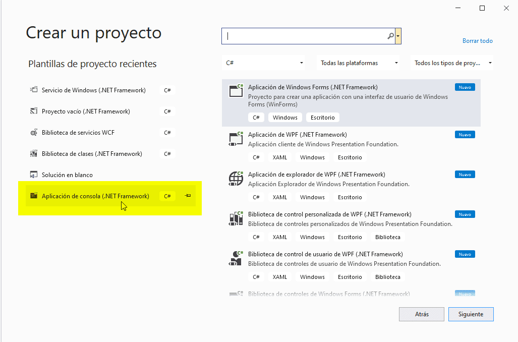 Primero crearemos un nuevo proyecto, una aplicación de consola (.NET framework 4.7.1), le damos un nombre cualquiera y aceptamos.